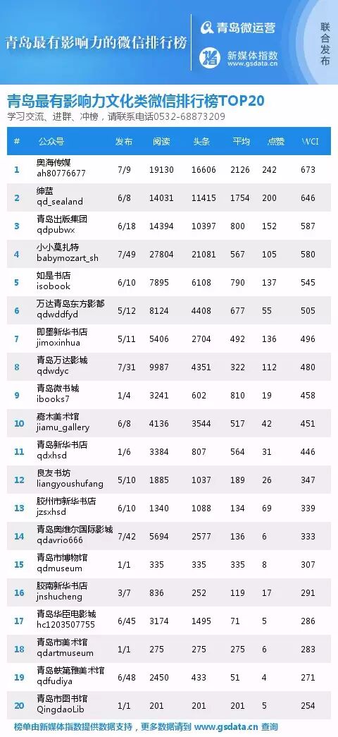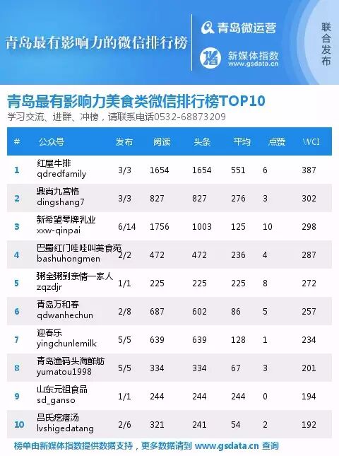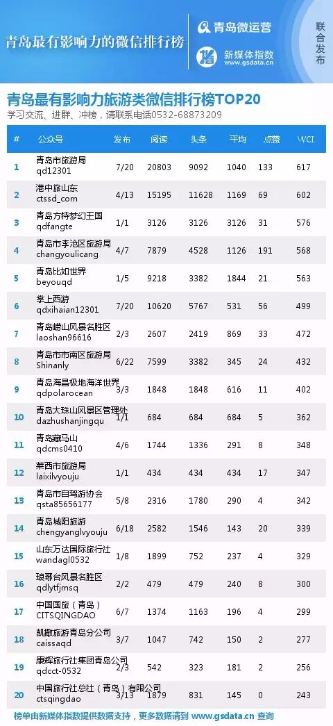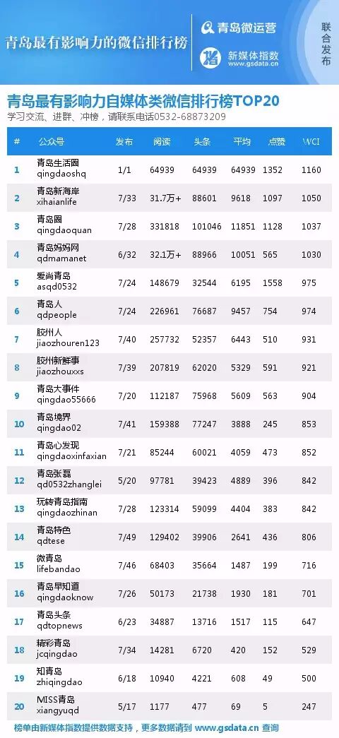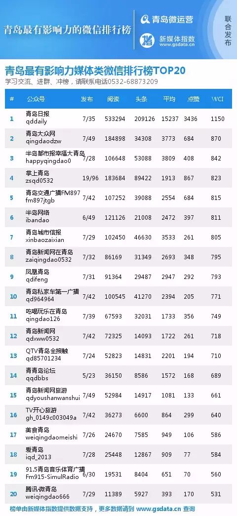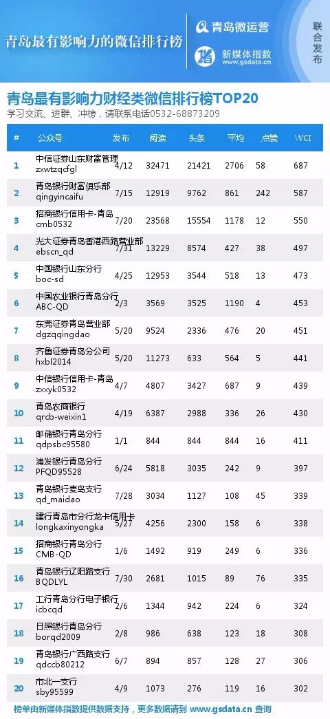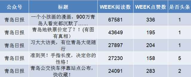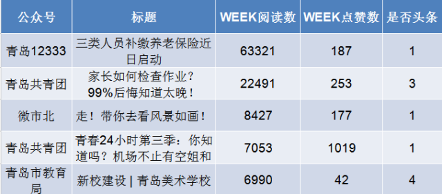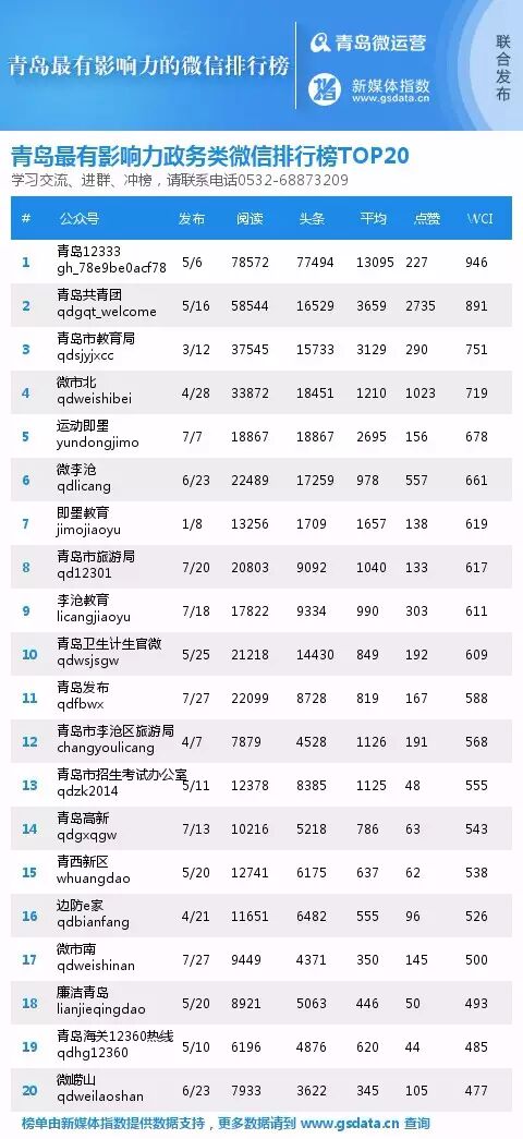 9月21日,青岛最有影响力微信排行榜第22期出炉,在本期政务类榜单中,青岛12333由上期的第14名跃居本期政务类榜首,可谓进步飞快。其发表的“三类人员补缴养老保险近日启动”一文阅读数高达63321次,高居政务类文章阅读数榜首,可见老百姓对养老保险问题的关注,同时这也说明,政务类微信只有多做百姓爱看的内容,才能获得大众的认可。 目前该榜单收录了政务、媒体、自媒体、财经、地产、学校、医院、汽车、旅游、婚嫁、文化、家居、商超、美食14个行业微信公众号,每周出榜一次。 为确保榜单的权威性、公正性,我们拒绝付费冲榜、拒绝潜规则、拒绝买粉等一切恶意营销公众号参评。“青岛最有影响力微信排行榜”由青岛新闻网微运营整理发布。数据来自新媒体指数。 ★最具人气奖(点赞数最多):青岛共青团 ★最有影响力奖(阅读数最多):青岛12333 ★最活跃奖(发布数最多):微市北 ★最具人气奖(点赞数最多):青岛日报 ★最有影响力奖(阅读数最多):青岛日报 ★最活跃奖(发布数最多):掌上青岛 ★最具人气奖(点赞数最多):青岛生活圈 ★最有影响力奖(阅读数最多):青岛圈 ★最活跃奖(发布数最多):青岛特色 ★最具人气奖(点赞数最多):青岛银行财富俱乐部 ★最有影响力奖(阅读数最多):招商银行信用卡-青岛 ★最活跃奖(发布数最多):光大证券青岛香港西路营业部 ★最具人气奖(点赞数最多):万达维多利亚湾 ★最有影响力奖(阅读数最多):万达维多利亚湾 ★最活跃奖(发布数最多):青岛科润城 ★最具人气奖(点赞数最多):青医附院 ★最有影响力奖(阅读数最多):青岛开发区第一人民医院 ★最活跃奖(发布数最多):青岛开发区第一人民医院 ★最具人气奖(点赞数最多):中国海洋大学 ★最有影响力奖(阅读数最多):中国海洋大学 ★最活跃奖(发布数最多):青岛大学报、中国海洋大学学生会 ★最具人气奖(点赞数最多):奥海传媒 ★最有影响力奖(阅读数最多):奥海传媒 ★最活跃奖(发布数最多):小小莫扎特 ★最具人气奖(点赞数最多):雪佛兰山东 ★最有影响力奖(阅读数最多):雪佛兰山东 ★最活跃奖(发布数最多):起亚青岛韩亚4S店 ★最具人气奖(点赞数最多):青岛市李沧区旅游局 ★最有影响力奖(阅读数最多):青岛市旅游局 ★最活跃奖(发布数最多):青岛市市南区旅游局 ★最具人气奖(点赞数最多):青岛万象城 ★最有影响力奖(阅读数最多):青岛海信广场 ★最活跃奖(发布数最多):永旺东部店 ★最具人气奖(点赞数最多):青岛罗曼庭婚纱摄影 ★最有影响力奖(阅读数最多):圣瓦伦丁婚纱摄影 ★最活跃奖(发布数最多):爱上东海岸婚纱摄影 ★最具人气奖(点赞数最多):海博家居 ★最有影响力奖(阅读数最多):海博家居 ★最活跃奖(发布数最多):海博家居 ★最具人气奖(点赞数最多):红屋牛排 ★最有影响力奖(阅读数最多):新希望琴牌乳业 ★最活跃奖(发布数最多):新希望琴牌乳业 更多运营经验,欢迎进入“青岛自媒体联盟群”交流讨论,小编期待您的加入!“青岛最有影响力微信排行榜”第22期