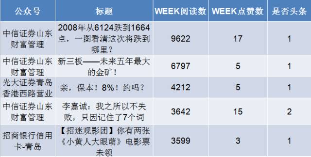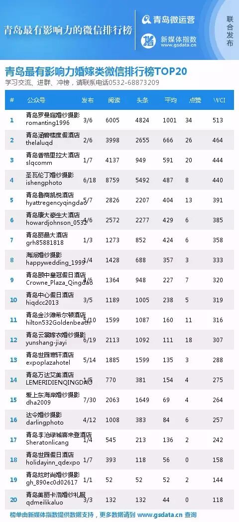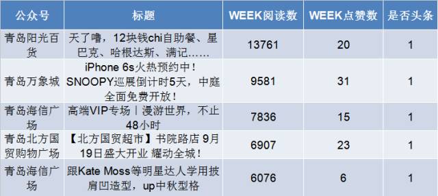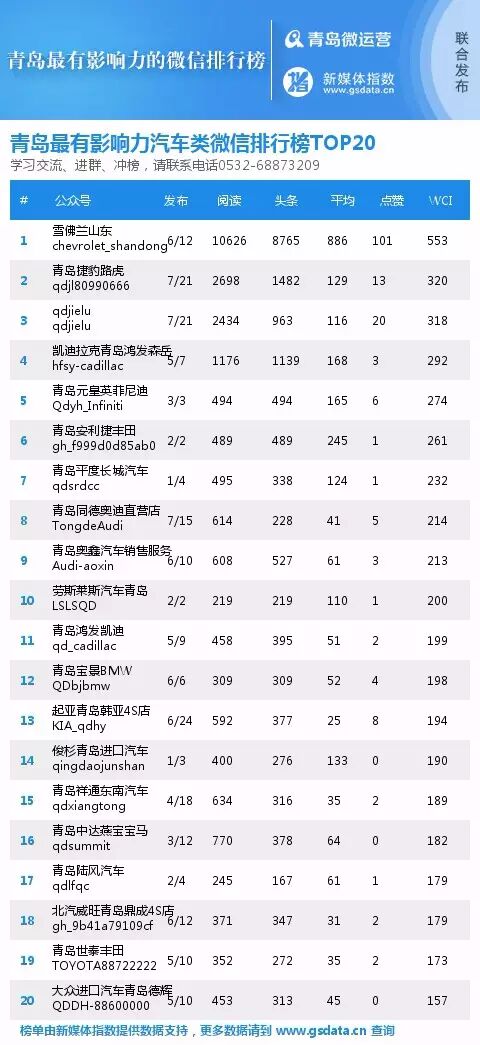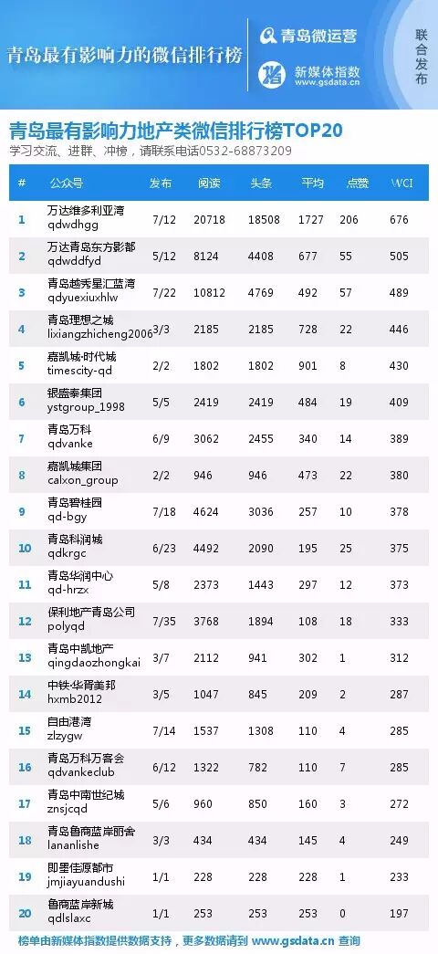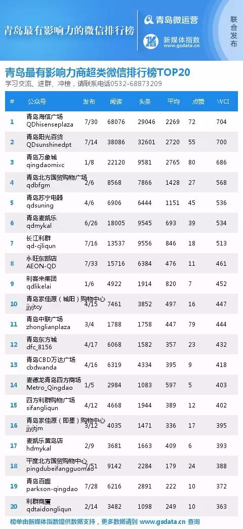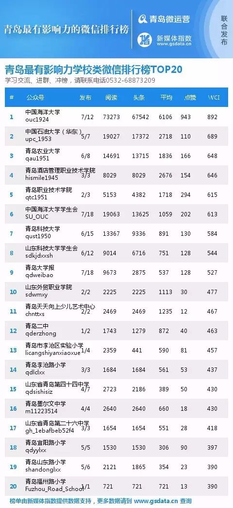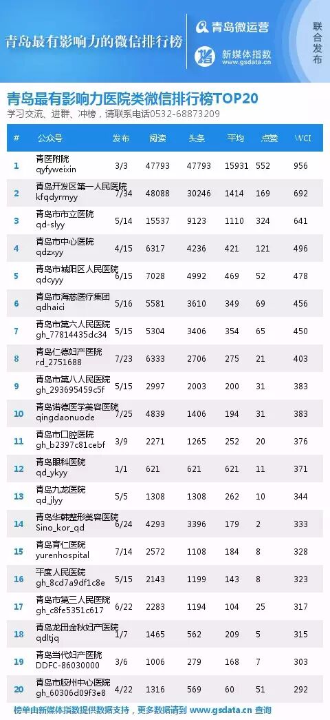9月21日,青岛最有影响力微信排行榜第22期出炉,在本期政务类榜单中,青岛12333由上期的第14名跃居本期政务类榜首,可谓进步飞快。其发表的“三类人员补缴养老保险近日启动”一文阅读数高达63321次,高居政务类文章阅读数榜首,可见老百姓对养老保险问题的关注,同时这也说明,政务类微信只有多做百姓爱看的内容,才能获得大众的认可。 目前该榜单收录了政务、媒体、自媒体、财经、地产、学校、医院、汽车、旅游、婚嫁、文化、家居、商超、美食14个行业微信公众号,每周出榜一次。 为确保榜单的权威性、公正性,我们拒绝付费冲榜、拒绝潜规则、拒绝买粉等一切恶意营销公众号参评。“青岛最有影响力微信排行榜”由青岛新闻网微运营整理发布。数据来自新媒体指数。 ★最具人气奖(点赞数最多):青岛共青团 ★最有影响力奖(阅读数最多):青岛12333 ★最活跃奖(发布数最多):微市北 ★最具人气奖(点赞数最多):青岛日报 ★最有影响力奖(阅读数最多):青岛日报 ★最活跃奖(发布数最多):掌上青岛 ★最具人气奖(点赞数最多):青岛生活圈 ★最有影响力奖(阅读数最多):青岛圈 ★最活跃奖(发布数最多):青岛特色 ★最具人气奖(点赞数最多):青岛银行财富俱乐部 ★最有影响力奖(阅读数最多):招商银行信用卡-青岛 ★最活跃奖(发布数最多):光大证券青岛香港西路营业部 ★最具人气奖(点赞数最多):万达维多利亚湾 ★最有影响力奖(阅读数最多):万达维多利亚湾 ★最活跃奖(发布数最多):青岛科润城 ★最具人气奖(点赞数最多):青医附院 ★最有影响力奖(阅读数最多):青岛开发区第一人民医院 ★最活跃奖(发布数最多):青岛开发区第一人民医院 ★最具人气奖(点赞数最多):中国海洋大学 ★最有影响力奖(阅读数最多):中国海洋大学 ★最活跃奖(发布数最多):青岛大学报、中国海洋大学学生会 ★最具人气奖(点赞数最多):奥海传媒 ★最有影响力奖(阅读数最多):奥海传媒 ★最活跃奖(发布数最多):小小莫扎特 ★最具人气奖(点赞数最多):雪佛兰山东 ★最有影响力奖(阅读数最多):雪佛兰山东 ★最活跃奖(发布数最多):起亚青岛韩亚4S店 ★最具人气奖(点赞数最多):青岛市李沧区旅游局 ★最有影响力奖(阅读数最多):青岛市旅游局 ★最活跃奖(发布数最多):青岛市市南区旅游局 ★最具人气奖(点赞数最多):青岛万象城 ★最有影响力奖(阅读数最多):青岛海信广场 ★最活跃奖(发布数最多):永旺东部店 ★最具人气奖(点赞数最多):青岛罗曼庭婚纱摄影 ★最有影响力奖(阅读数最多):圣瓦伦丁婚纱摄影 ★最活跃奖(发布数最多):爱上东海岸婚纱摄影 ★最具人气奖(点赞数最多):海博家居 ★最有影响力奖(阅读数最多):海博家居 ★最活跃奖(发布数最多):海博家居 ★最具人气奖(点赞数最多):红屋牛排 ★最有影响力奖(阅读数最多):新希望琴牌乳业 ★最活跃奖(发布数最多):新希望琴牌乳业 更多运营经验,欢迎进入“青岛自媒体联盟群”交流讨论,小编期待您的加入!“青岛最有影响力微信排行榜”第22期