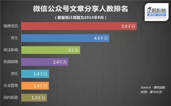 这两个表格展示得很清楚:情感、养生和政法新闻稳居阅读人数和分享人数前三名。尤其是情感资讯和养生内容,远超过其它类内容,用户既爱阅读也爱分享。只要是你发送的内容大方向是对的那么就不愁没人转发了,