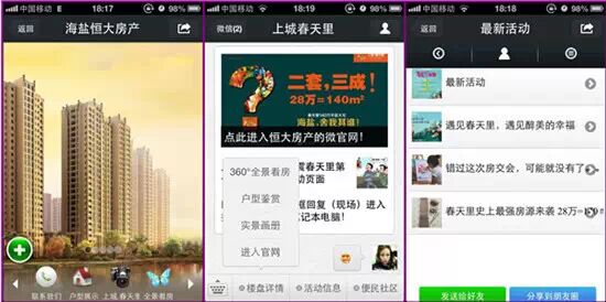房地产(专题阅读)是一个非常需要广告投入的行业,比如户外广告、电视广告、报纸报告等等,因此,面对超过6亿的微信用户,瞄准于微信营销是完全正确的。为了更好的了解和运用房地产行业微信营销,青岛微运营小编梳理了2014年房地产微信营销十大经典案例,其中部分案例来自互联网,欢迎补充。