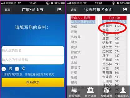 广夏集团与国内最大的微信营销服务商微信生意宝合作,定制微信报名入口,将登山节活动用微信游戏的方式呈现,参与者填写姓名电话即可生成专属活动页面,将该页面分享给朋友,只要朋友参与即可增加参与者的助力数,该助力数觉得抽奖的资格,并且助力数最多的50人将在页面上呈现,旁边就是参与者的助力数以及好友助力名单。丰厚的奖品+有趣的游戏,使得该活动的微信朋友圈引起病毒传播,8天时间就吸引了30万人参与。目前助力数第一的参与者已经成功邀请了1122人参与了活动。